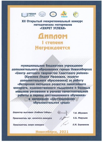 Методическому пособию «Авторская методика развития понятийного аппарата, художественного мышления и базовых навыков рисования в рамках самостоятельной работы в период дистанционного обучения» (автор: Л. И. Красина) присвоен Диплом I степени.