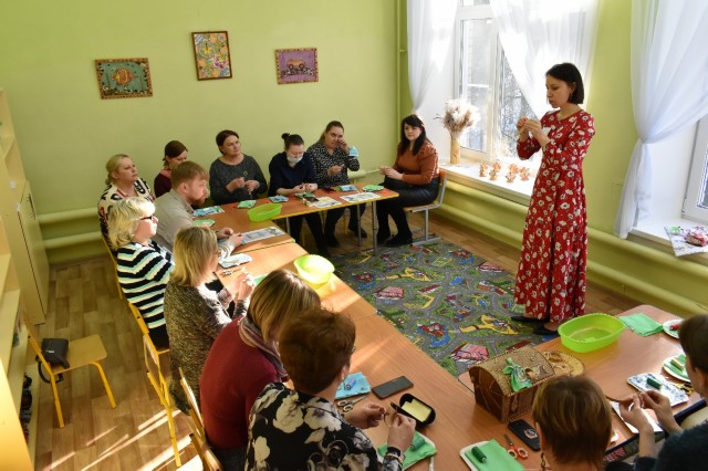 Затем гости посетили творческую мастерскую и приняли участие в мастер-классах по изготовлению браслетов из бересты (под руководством Л. В. Ишутиной) и куколок из ткани (под руководством В. В. Харьковской). Педагоги внимательно слушали о бересте, о том, что делали из нее в давние времена на Руси (туеса, лапти, лукошки, пастушьи рожки, браслеты), с интересом рассматривали обрядовых и игровых кукол Сибири – куватку (кукла на рождение), большуху, капустницу, подорожницу, хороводницу и девку-бабу. Участники стажерской площадки покидали творческую мастерскую с очаровательными берестяными украшениями и небольшими изящными куколками «Отдарок на подарок».