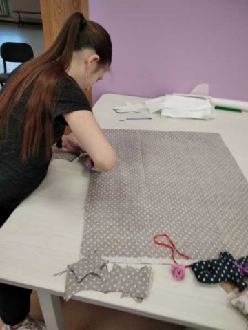 Изготовление медвежат – довольно трудоемкий процесс. Девочки выбрали ткань – бязь с мелким рисунком, раскроили мишек по лекалам, с учетом припусков на швы, сшили детали на швейных машинах, набили синтепоном, приклеили глазки и носики, затем добавили украшения – бантики. В результате сделали вывод: сама сложная операция – это машинная строчка – очень много поворотов, маленьких закруглений, а также небольшая ширина шва (0,5 см). Тем не менее, почти все справились, и даже придумали дополнения к игрушке – сумки, юбки, жилетки. Некоторые девочки решили подарить своего мишку младшим сестрам и братьям.