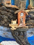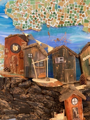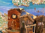 Ребята с удовольствием придумывали, каким будет их домик, при помощи акриловых красок и наждачной бумаги создавали эффект старины, а окна делали из пуговиц. Дети выполняли панно с большим удовольствием, развешивая белье, делая качели, сеть с рыбками, дрова у домика, забор с небольшим огородом, придумывая антенны и другие разнообразные детали.